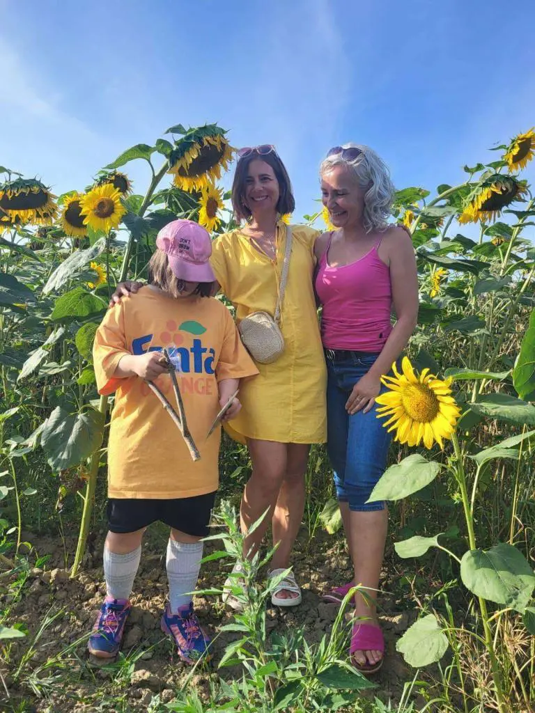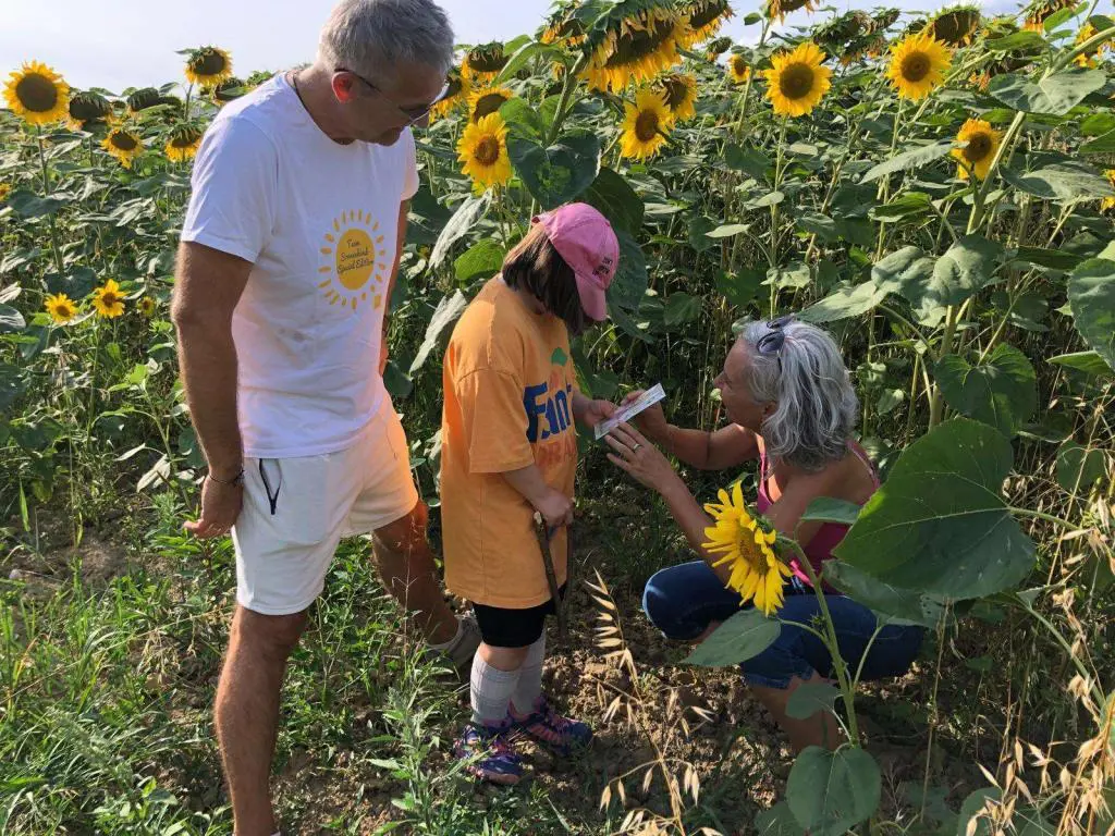 Passend zu unserem Verein: die Übergabe der Spende von Astrid an Mia im blühenden Sonnenblumenfeld