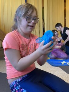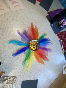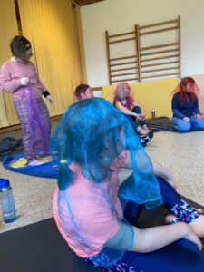 Wir stellten uns vor wie Blumen wachsen und die Sonne stärker wird, wir streckten uns wie die wachsenden Pflanzen, balancierten und verwandelten uns in verschiedene Tiere: wir machten einen langen Hals wie die Giraffe, wir flogen wie ein Adler, wir streckten als Elefant unseren Rüssel und vieles mehr. Dabei wurde viel gelacht und ausprobiert, das machte besonders den Kindern großen Spaß.